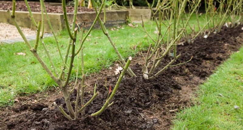 - Dig a generous planting hole about 30cm deep and wide enough so the roots fit easily without bending. Make a small mound in the hole and position the roots over the mound so that the bud union of your rose plant sits about 5cm above ground level then backfill with soil. Water well to remove air pockets and add an organic mulch layer but avoid putting the mulch up around the stem.