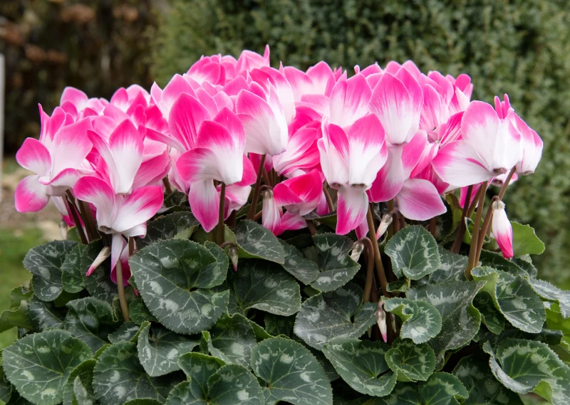 A bowl of mini cyclamen on an outdoor table will provide enticing colour for months, provided they receive protection from heavy rain, frost and hot sun. Cyclamen also make beautiful gifts in colours to suit any décor, in many shades of pink, red and white including bicolour forms.
