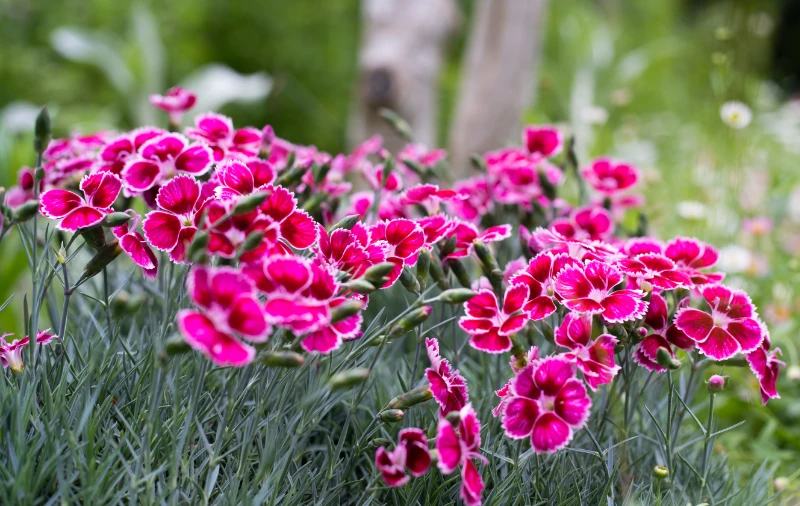A tight mounding growth habit is an excellent way for a plant to reduce moisture loss from its leaves and keep its roots cool. The latest ‘Flutterburst’ dianthus are a perfect example. Blooming profusely on close-packed hummocks of blue foliage, they seemed to relish summer’s dry conditions. ‘Cherryburst’ tops its tidy mounds with an abundance of simple dianthus flowers in extraordinary tones of hot pink and white.