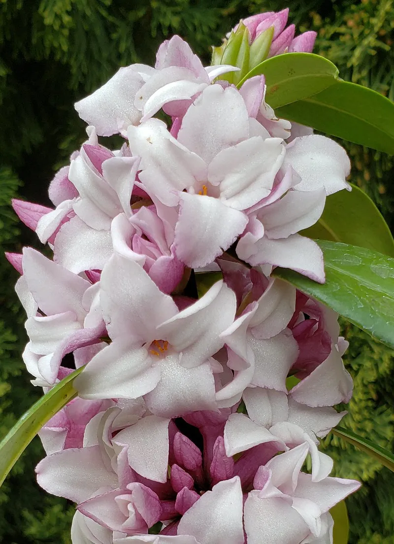 Daphne ‘Perfume Princess’™ is a robust evergreen with dark glossy green leaves which set off her extra-large flowers (four times the size of Daphne odora). Preferring well drained soil and part but not deep shade, ‘Perfume Princess’™ is tolerant of most garden situations and is perfect for a large pot by an entrance or outdoor seating area where her fragrance can be fully appreciated.