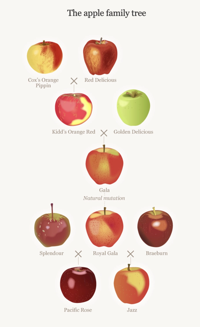Royal Gala first arose as a sport (random shoot) of the original Gala apple, bred in Greytown in the 1930’s from a seedling of a cross between a Golden Delicious and a Kidd's Orange Red.