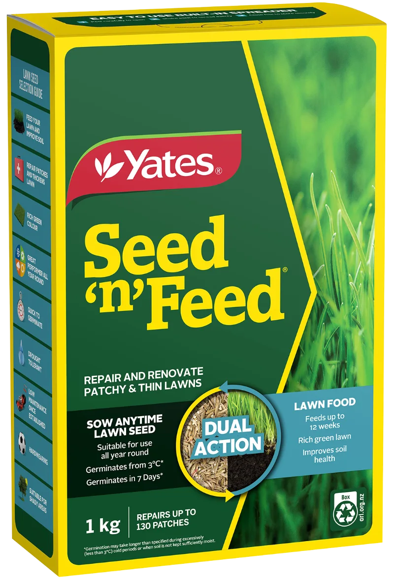 Bare patches ruin the look of a lawn and they also invite weeds. To repair a bare patch, prepare the ground first so that the grass seed can make good contact with the soil. Mow the lawn and then remove dead grass and weeds. Gently cultivate and loosen the soil to create a nice soft and crumbly surface. For extra assurance, mix in some weed-free compost. Then scatter the seed and water gently using a watering can. Water regularly to keep the seed bed moist as the new grass grows. Available in small packs for perfect for small repair jobs, Yates Seed’n'Feed combines fast germinating seed with controlled-release fertiliser.