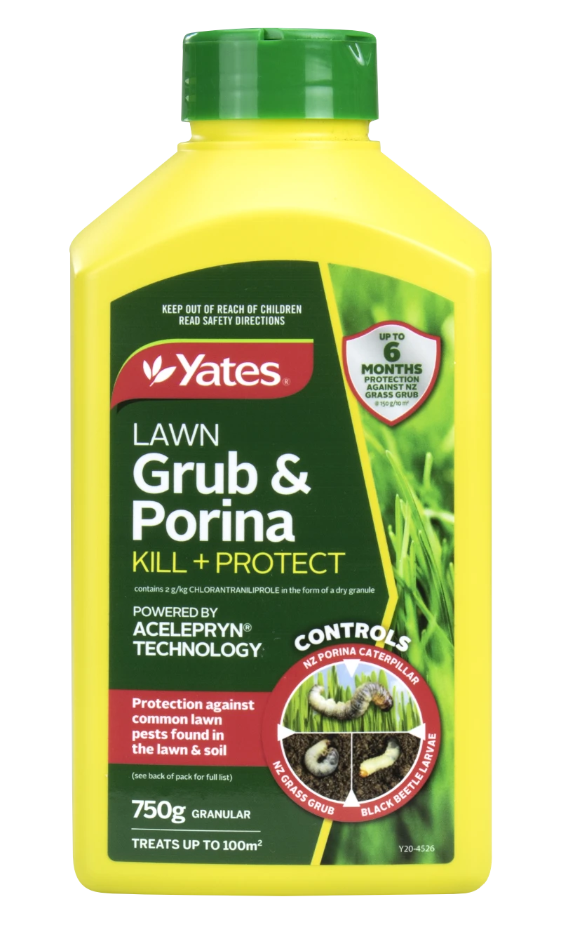 Yates® Lawn Grub & Porina Kill +Protect will both kill the grubs and the adult stage. When used at the recommended rate one application will protect a lawn for up to six months.