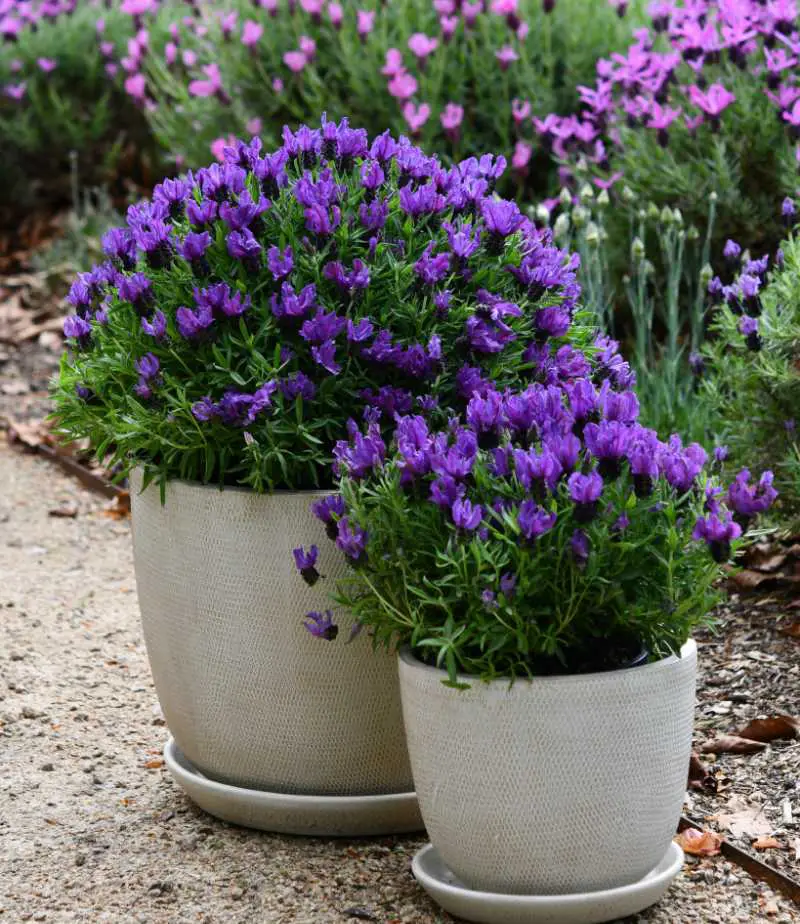 The Royal series of lavenders come from careful crossing of Lavendula pedunculata hybrids to achieve outstanding form and flower performance. Commonly known as Spanish lavenders, these unrivalled flowering performers are characterised by narrow grey green aromatic leaves and long-stemmed flowers with over-large flower bracts. They have medium to low water requirements and are versatile and easy-care when grown as hedging, in the flower border or in containers. To encourage optimum flowering feed with slow-release fertiliser in late winter and early autumn.