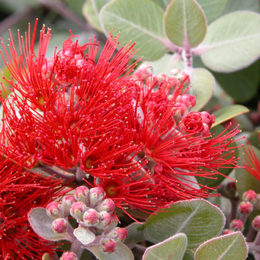 Metrosideros grow easily from seed and will freely interbreed in the wild. This leads to each tree having slightly different genes from its neighbour, a natural diversity that has in turn led to some excellent selections being developed for gardens. When nursery professionals discover a naturally occurring tree with superior traits (such as tidy shape, early flowering, bigger and brighter blooms, sheer volume of blooms or compact size, they are able to propagate it by cuttings. And hence we gardeners can choose a named variety that grows ‘true to type’ and meets our needs.