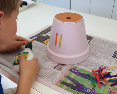 Finally, after your pots have been decorated and are dry, fill them with potting mix and start planting. Max decided to plant some lettuces and basil, but you might like to try flowers or spring bulbs.