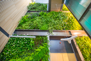 Two huge walls, each 60-square-metres face each other across a central atrium. The initial reaction, when one walks into the Atrium, is the absolute wow factor of this eco art but, besides that, the plants improve the air quality, add to insulation and enhance acoustics in what would otherwise be a noisy glass-clad area. It has been there for five years, and still looks fabulous, proving the technology behind it, and maintenance of it, works well.