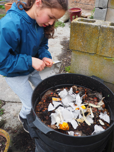 A successful compost pile needs both ‘green’ (mainly nitrogen) and brown’ (mainly carbon) matter built up in layers. Start with a brown layer then cover every new layer of green material with another layer of brown. This helps prevent smells and flies. Accessible sources of brown material include shredded cardboard and newspaper. During autumn and winter, get the kids to help gather and stockpile fallen leaves. These are among the richest, most valuable of compost ingredients, and arguably all you need. A sack of untreated sawdust or a bale of straw kept next to the compost heap are other convenient sources of brown material.